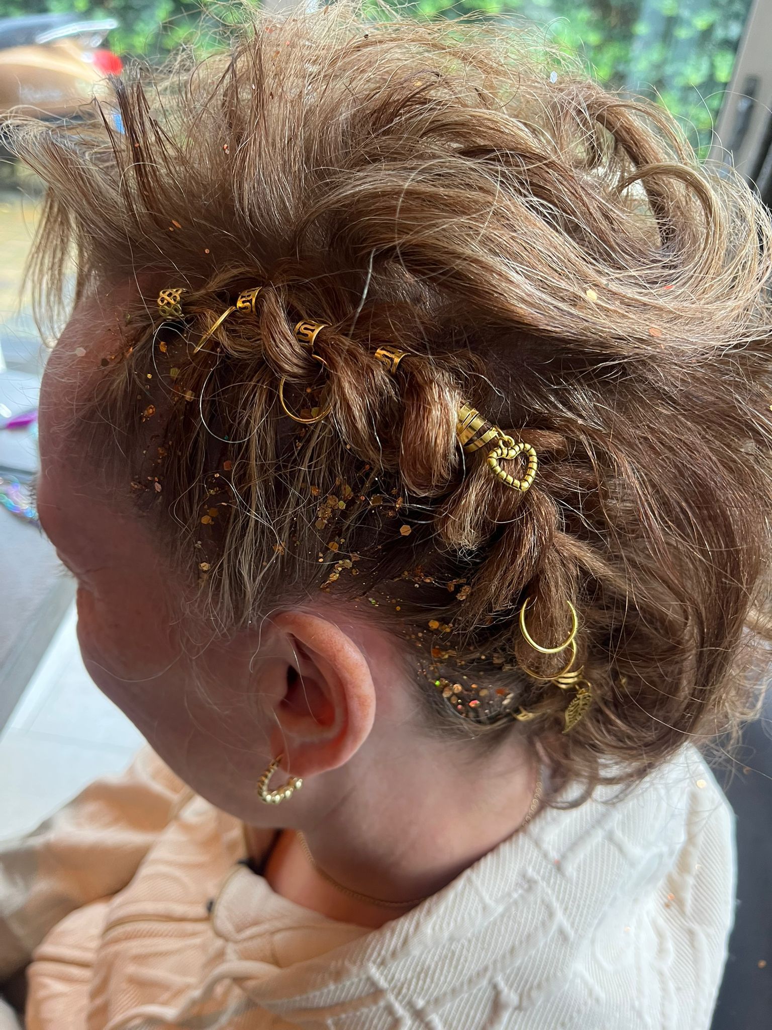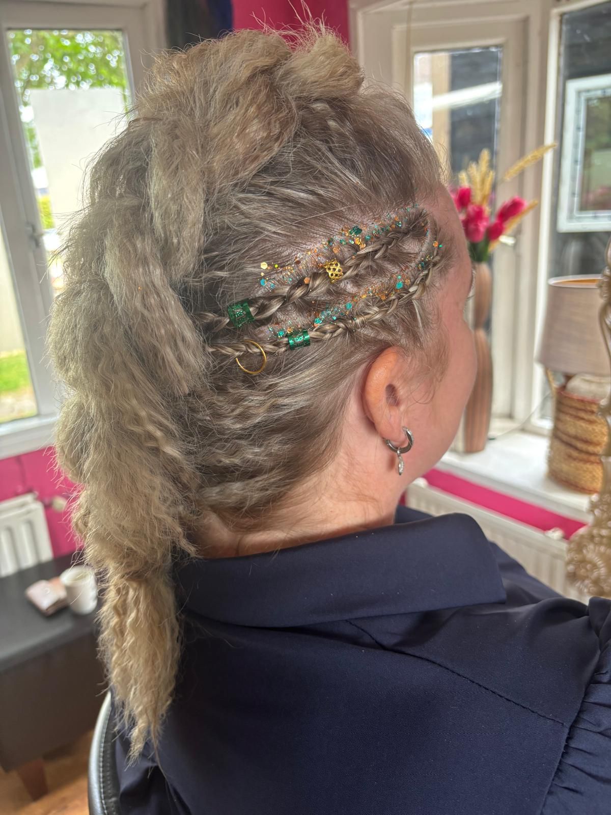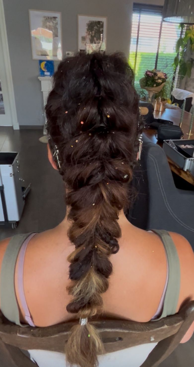 Schitterende vlecht met parels en glitters en een tinsel