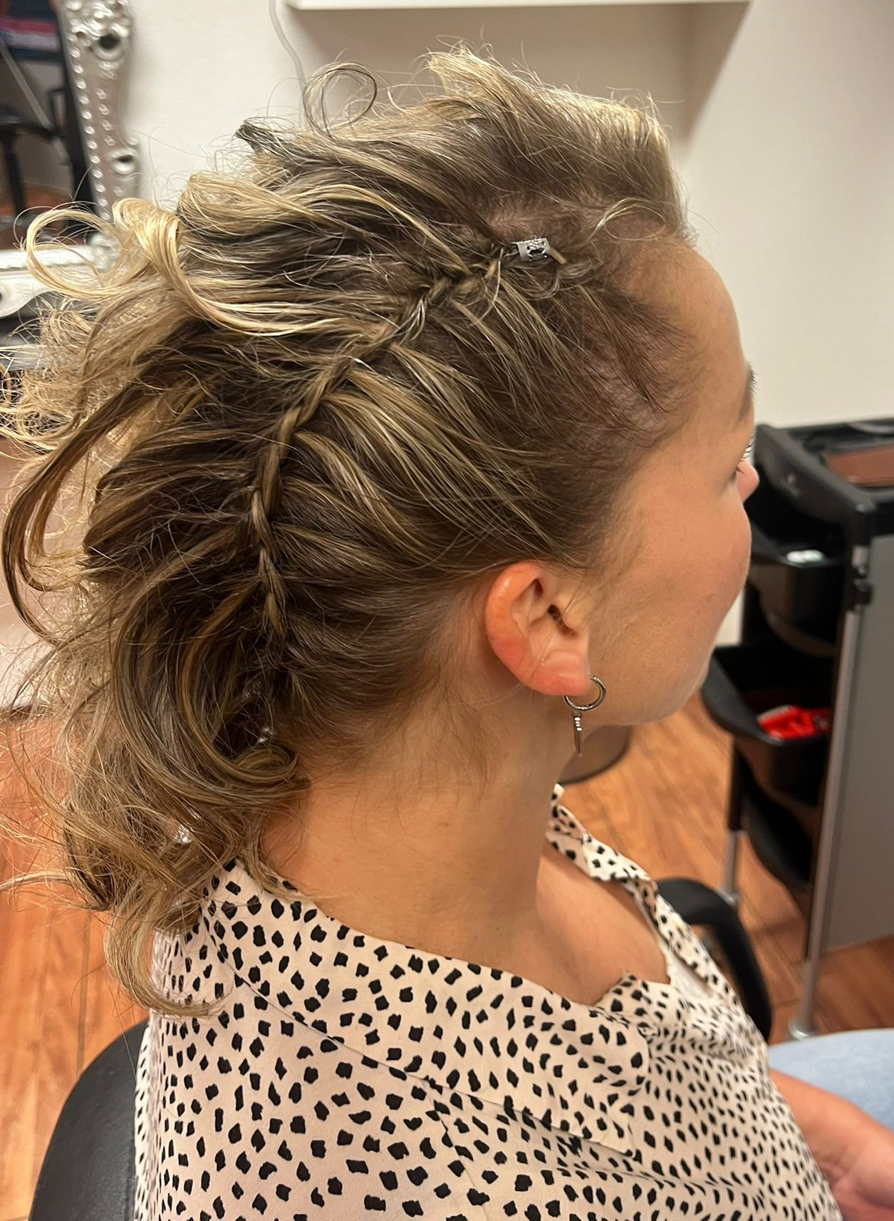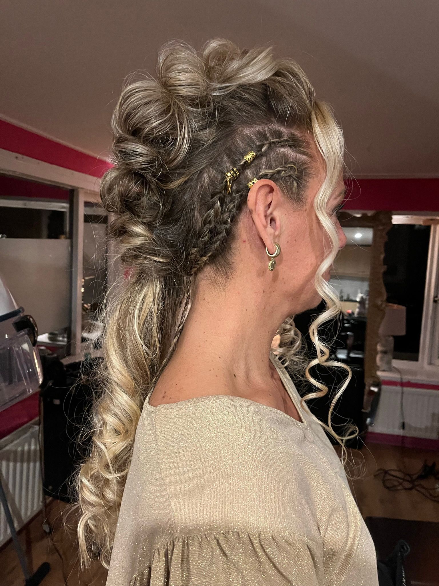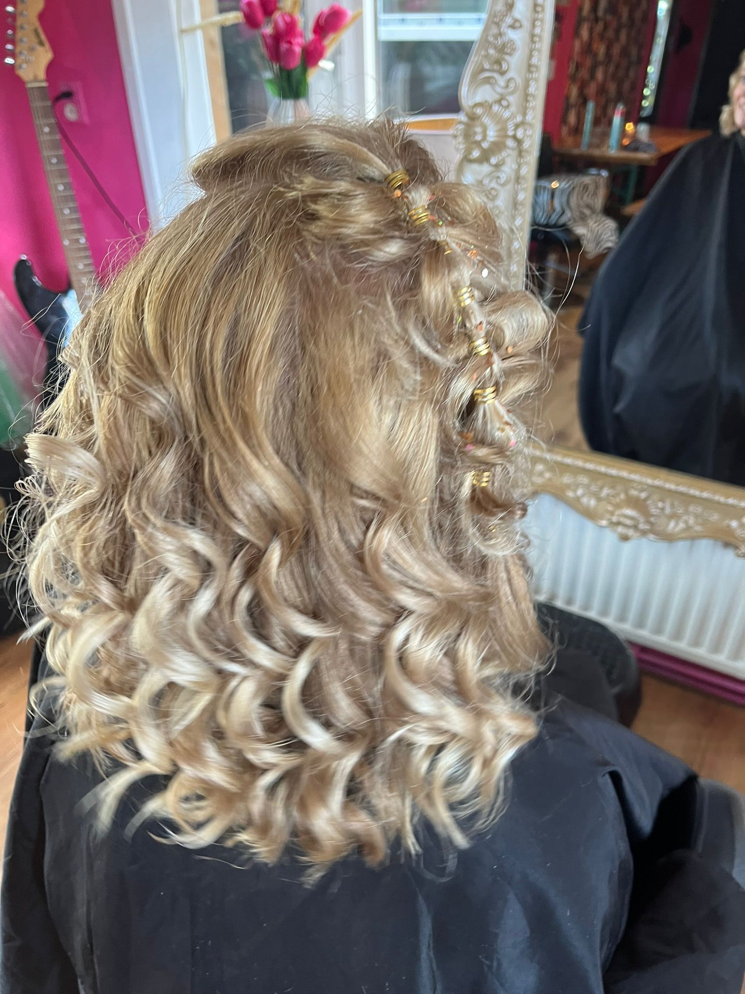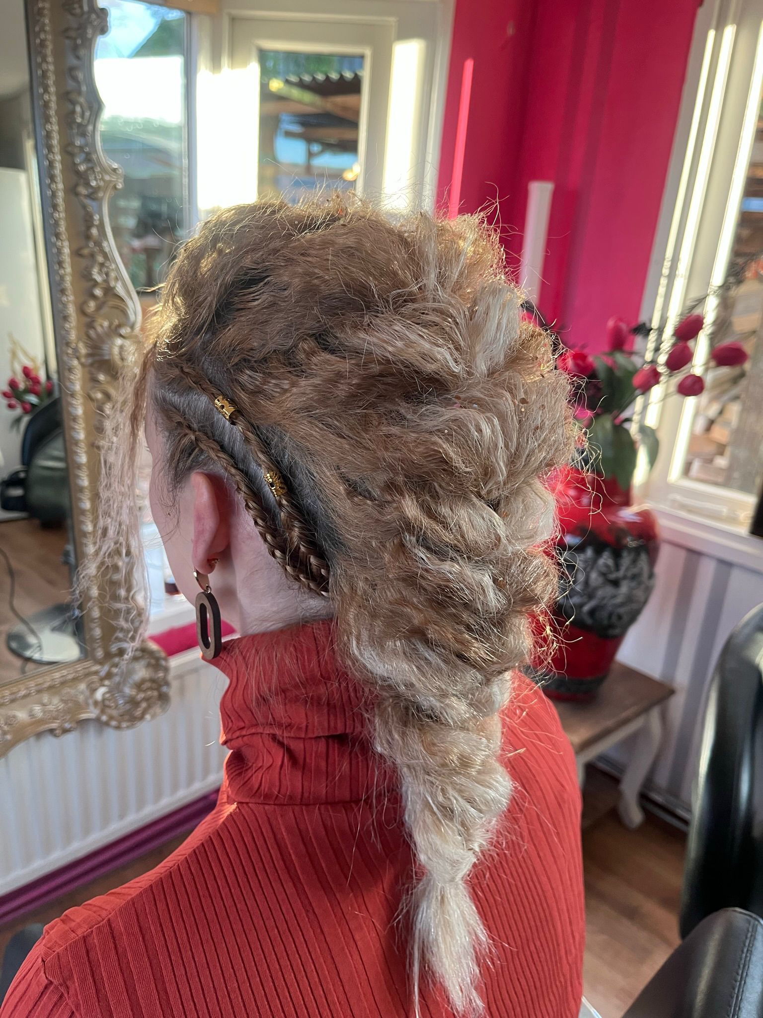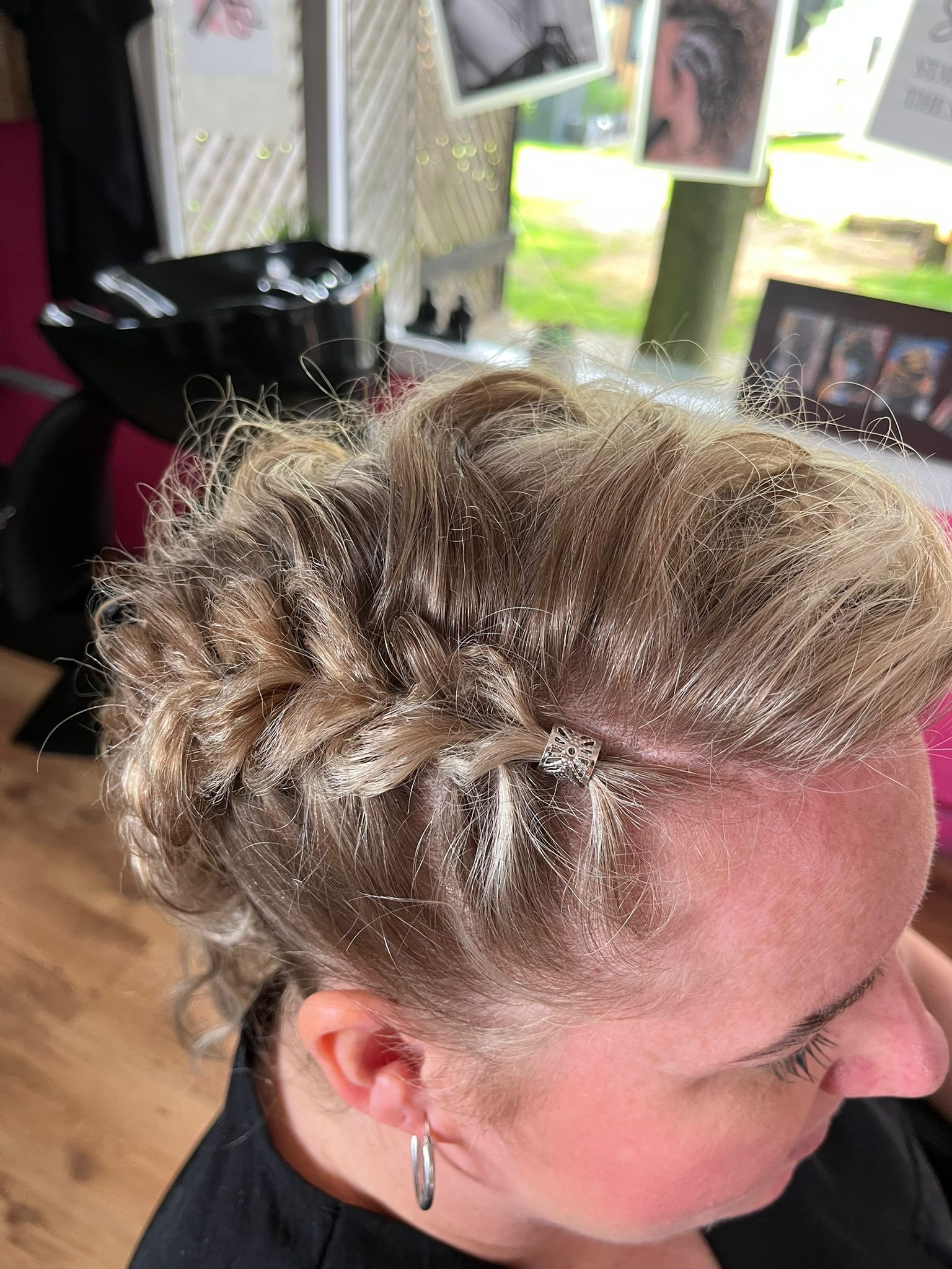 Mooie blonde vlecht met parels en glitters.